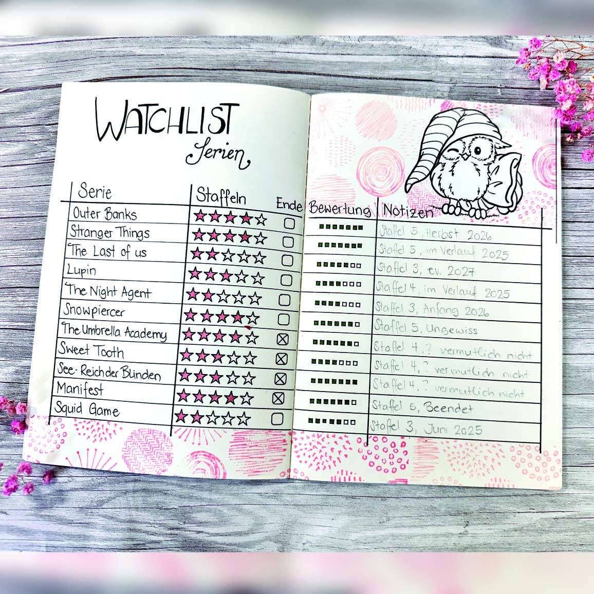 Es reicht meist ein einfaches Blatt oder Notizbuch, um eine Liste eurer liebsten Filme oder Serien festzuhalten. Bei Daniela sind sie obendrein noch wunderhübsch gestaltet, z. B. mit den Stempeln "Verschlafene Eule Nuppi" (kreativbunt) oder "Ecliptic" (Sizzix).