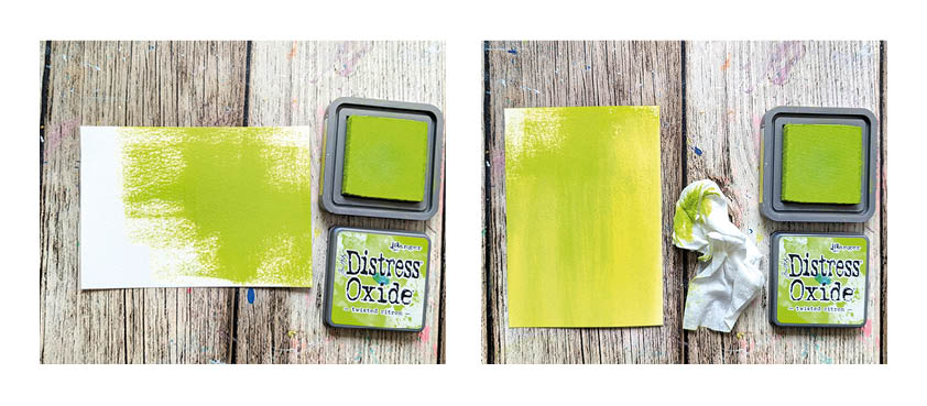 Distress Oxide Inks könnt ihr in unterschiedlichen Ebenen übereinander auftragen. Da sie opak sind (lichtundurchlässig) funktioniert das auch mit helleren Farben auf dunklem Hintergrund. Natürlich werden die Farben hier nicht so leuchtend, wie auf weißem Papier. Es ist dennoch einen Versuch wert.