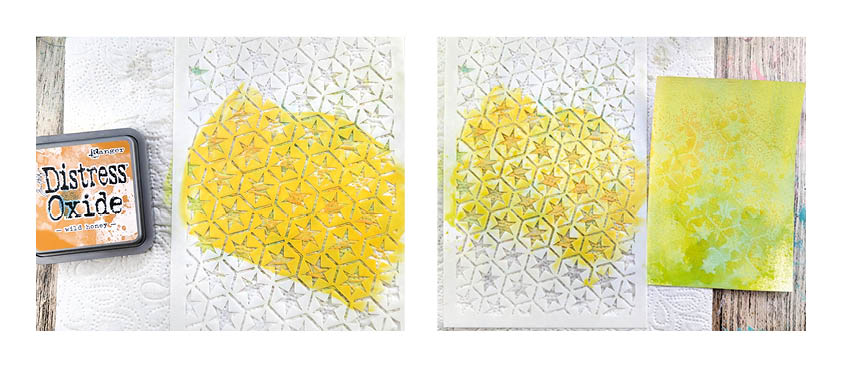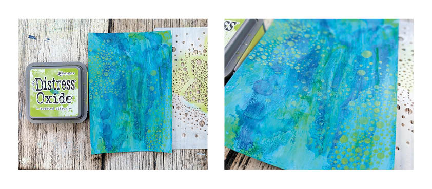 Viele von euch, kennen diese Technik bestimmt. Ihr könnt ganz leicht mit Schablone, Stempelkissen und Blending-Tool die Muster aufs Papier bringen. Dafür bietet sich nicht nur weißes Papier an, sondern Hintergründe, die ihr in den vorigen Schritten vorbereitet habt. Distress Oxide Inks können gut in Ebenen aufgetragen werden.