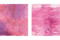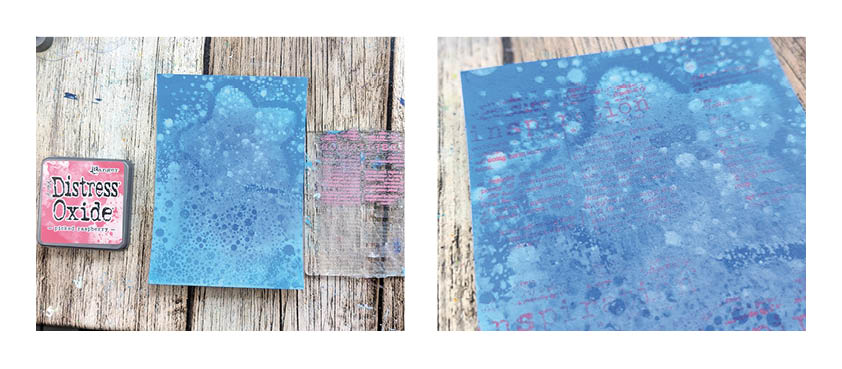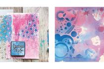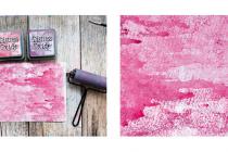 Um eure einfarbigen Hintergründe etwas aufzuhübschen, legt eine Schablone darauf und übersprüht beides mit Wasser. Lasst es kurz einwirken und tupft es mit einem trockenen Tuch ab. Hebt die Schablone vorsichtig ab. Nun solltet ihr eine hübsche Struktur erhalten, die das Motiv der Schablone andeutet. Das funktioniert am besten, wenn die Stempelfarbe im Untergrund nicht verdünnt, also recht viel Farbe zum Abnehmen vorhanden ist.
