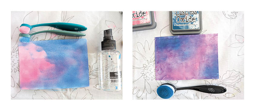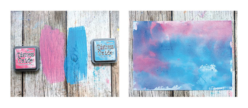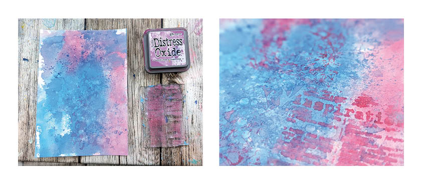 Die Distress Oxide Inks von Ranger erfreuen sich nach wie vor große Beliebtheit. Für viele Kreative ist das Wischen der Farben bekannt, ebenso die Verwendung mit Schablonen oder das Spritzen mit Wasser über die Farbe. Doch da die Stempelkissen sehr gut mit Wasser reagieren, gibt es noch zahlreiche andere Anwendungsmöglichkeiten. Anke zeigt euch in diesem Artikel, was ihr noch alles Spannendes mit den Distress Oxide Inks machen könnt.Der Klassiker. Mit einer entsprechenden feinen Bürste (auch Brush genannt) oder einem Verblender (Blending-Tool) könnt ihr eure Wunschfarben verblenden. Ihr nehmt mit eurem Werkzeug Farbe aus dem Stempelkissen auf und wischt vom Rand eures Papiers die Farbe. Eigentlich ist es auch egal, welches Papier ihr nehmt, es sollte jedoch keine zu glatte Oberfläche haben (wie z.B. Fotopapier oder YUPO Papier), denn wenn ihr mit Wasser arbeitet, muss das Papier dieses aufsaugen können. Cardstock oder Aquarellpapier eignen sich ganz gut dazu.