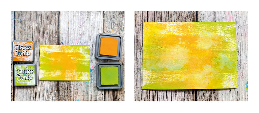 RECHTS: Habt ihr ein größeres Papier mit Distress Oxide Inks gestaltet, könnt ihr es auch kleinschneiden und für den Hintergrund einer ATC (Artist Trading Card) verwenden. Diese Methode eignet sich besonders gut, wenn ihr eine Menge Karten gestalten wollt.