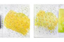 Diese Technik geht auch gut mit zwei Farben. Ist Farbe an eurer Walze übrig, könnt ihr diese mit Wasser besprühen und auf einem separaten Blatt abrollen. Das ergibt einen schönen Aquarelleffekt (rechtes Bild).