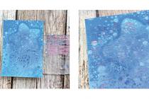 Ihr werdet bestimmt noch etwas Farbe an der Unterseite der Schablone haben, da etwas von dem Sprühwasser darunter gelaufen ist. Wischt es nicht einfach weg, sondern drückt es auf ein anderes Papier eurer Wahl, um auch das mit etwas Textur zu versehen.