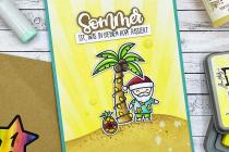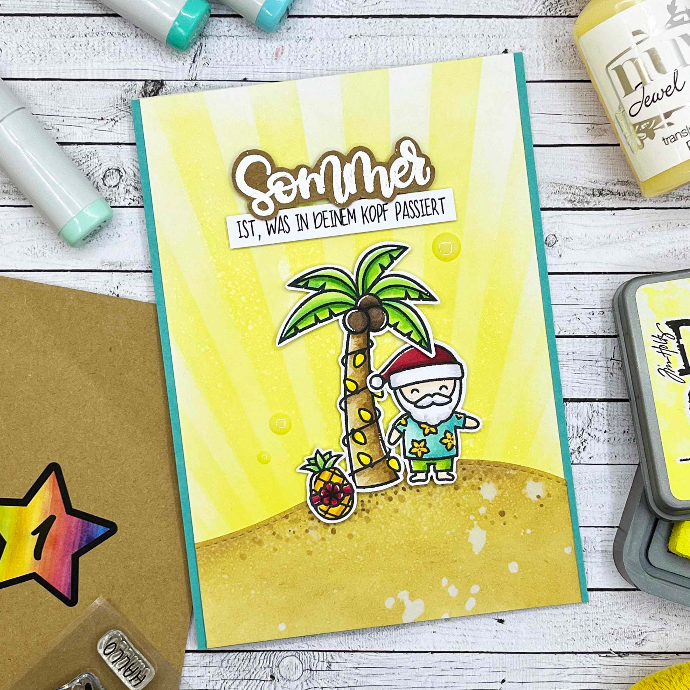 Als Lisa (@catsndcrafts) das erste Türchen öffnete, hatte sie sofort ein Lied im Kopf. Zusammen mit dem Weihnachtsmann aus dem Stempelset "Beachy Christmas" entstand diese sommerliche Szene.