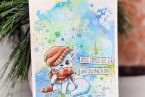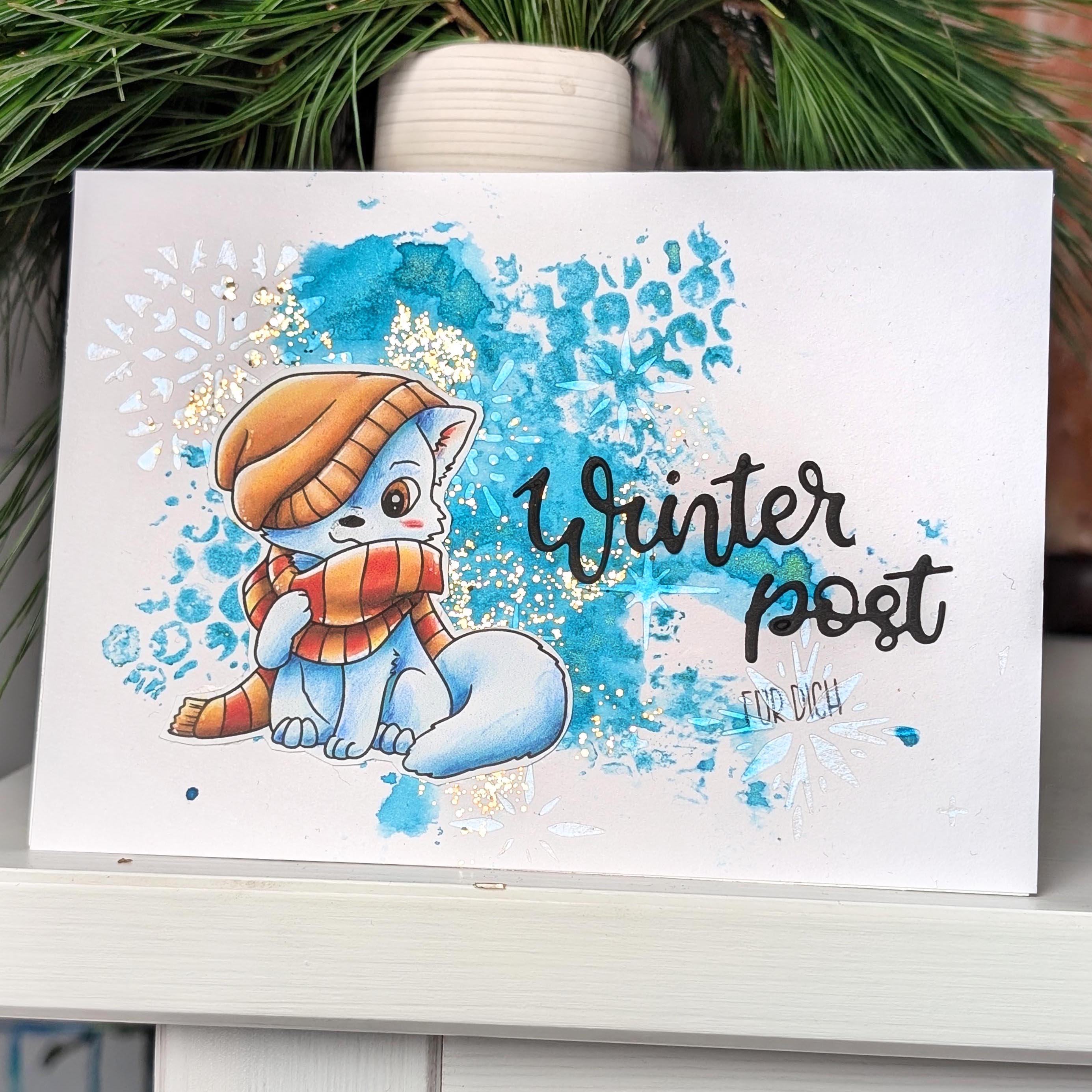 Passend zur süßen Polarfüchsin Auri (Artikel-Nr. 00121721) hat Anke (FB: Zwischen Farbe und Wort) im Hintergrund ein Schneegestöber geschaffen. Zum einem mit dem Schneestempel aus dem heutigen Adventskalender-Türchen (Artikel-Nr. 00117820), zum anderen mit Schablone und Halo Paste (Artikel-Nr. 00096565) auf einem Aquarelluntergrund. Noch eine kleine Botschaft dazu (Artikel-Nr. 00121723) – fertig.