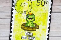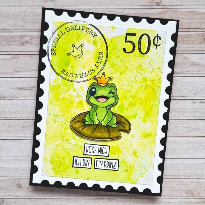 Im heutigen Türchen findet ihr einen Froschprinzen bzw. eine Froschprinzessin. Mit der “Oversized Postage” Stanze (Artikel-Nr. 00115831) und dem dazu passenden Stempelset (Artikel-Nr. 00115832) hat Anna (@creative.anna) eine Briefmarkenkarte gestaltet, auf der sie den Frosch und einen im Set enthaltenen Spruch auf einen Distress Ink Hintergrund gesetzt hat.