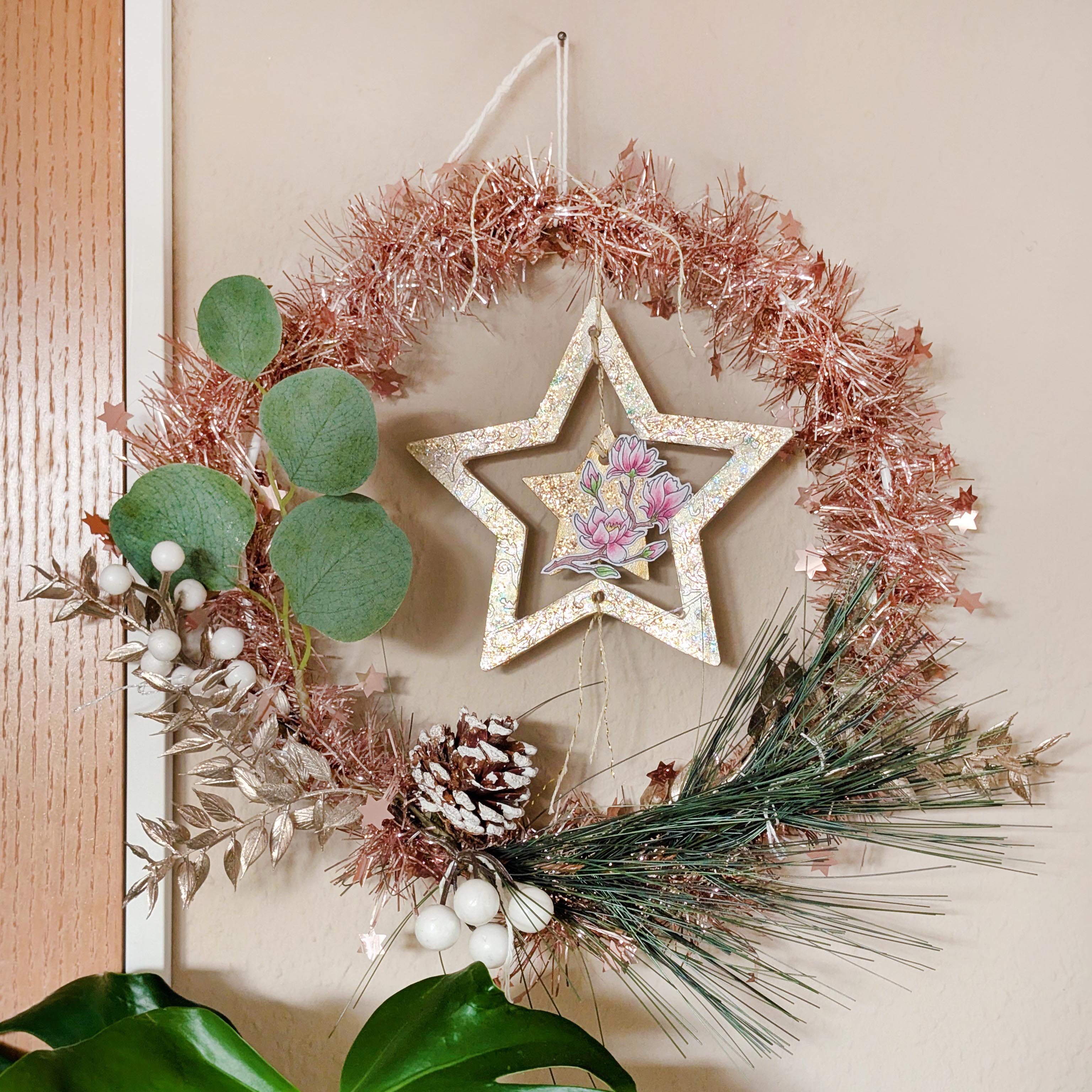 Den hübschen Stempel aus dem heutigen Adventskalender-Türchen (Artikel-Nr. 00117820) hat Anke (FB: Zwischen Farbe und Wort) auf einer ganz besonderen Art verwendet. Sie hat für ihre Weihnachtsdekoration eine Girlande in Altrosa verwendet, doch am Ende fehlte ihr im Zentrum ein passender Farbklecks. Also hat sie das kolorierte Motiv auf einen bemalten Holzstern (Artikel-Nr. 00120492) geklebt und so die Gestaltung abgerundet.