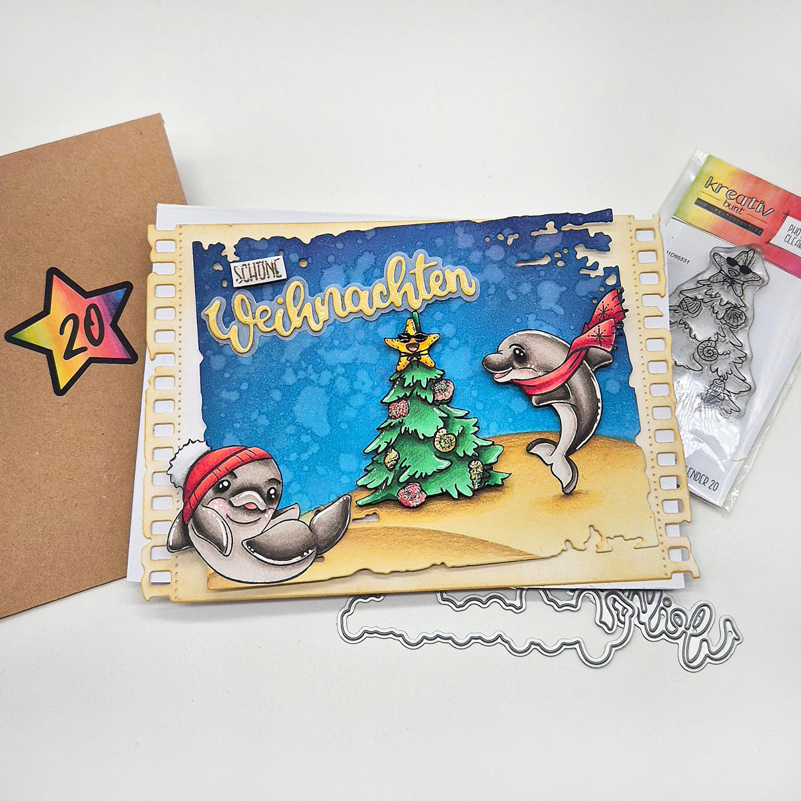 Wie Delfine Weihnachten feiern zeigt uns Cindys (@shadowschatti) Karte heute. In Tütchen 20 befindet sich ein Unterwasser-Weihnachtsbaum der mit allerlei Muscheln und dem süßen Seestern dekoriert ist. Den Delfinen (Artikel-Nr. 00087173) hat Cindy Mütze und Schal aus dem Set "Polar Bear" (Artikel-Nr. 00065979) angezogen. Die Outline Stanze "Layered Winterpost" (Artikel-Nr. 00120631) passt perfekt in die Szene.