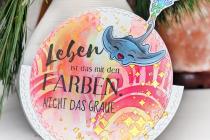 Eine runde Sache ist diese aufmunternde Schaukelkarte. Hier hat Anke (FB: Zwischen Farbe und Wort) den goldigen Rochen aus dem heutigen Adventskalender-Türchen (Artikel-Nr. 00117820) verwendet, der Farbe in das Leben des Empfängers bringt. Im Hintergrund lockern Aquarellfarbe, Schablonenmotive (Artikel-Nr. 00121122) und Halo Paste (Artikel-Nr. 00096565) die Gestaltung auf.