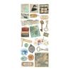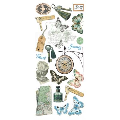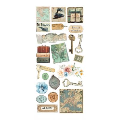 Vintage Kollektion zum Thema Reisen mit hübschen Szenen und Motiven wie Züge, Ferngläser, Karten und Blumen in den vorwiegenden Farben Blau, Gelb, Creme und Braun.