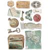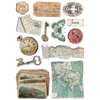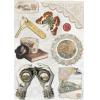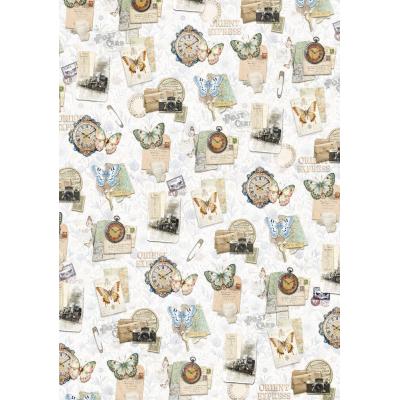Vintage Kollektion zum Thema Reisen mit hübschen Szenen und Motiven wie Züge, Ferngläser, Karten und Blumen in den vorwiegenden Farben Blau, Gelb, Creme und Braun.
