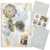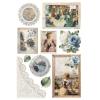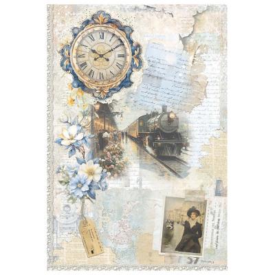 Vintage Kollektion zum Thema Reisen mit hübschen Szenen und Motiven wie Züge, Ferngläser, Karten und Blumen in den vorwiegenden Farben Blau, Gelb, Creme und Braun.