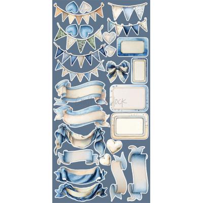 Hübsche Kollektion zum Thema Baby und kleine Jungs mit niedlichen Tiermotiven, Zahlen, Rahmen und den typischen Baby Accessoires in den Farben Blau, Braun, Gold, Grün und Weiß.