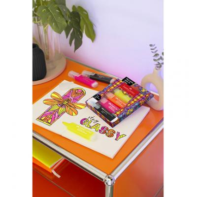 Dieses Set enthält Textmarker in Gelb, Orange, Pink und Schwarz. Die Neonfarben setzen mit der wasserbasierten Tinte leuchtende Akzente, der schwarze Marker eignet sich perfekt für Konturen. Die Keilspitze ermöglicht Markierungen in drei Strichstärken (1, 2 und 5 mm).