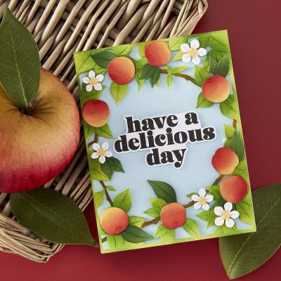Hero Arts hat das Motiv "Apple Frame" sowohl als Stanzschablonen (Artikel-Nr. 00123027) als auch als Layering Stencils (Artikel-Nr. 00123030) auf den Markt gebracht. Beide Produkte können einzeln genutzt werden, sie passen aber natürlich auch kombiniert perfekt zusammen. Falls ihr beides möchtet, so gibt es auch das Bundle aus beiden Produkten bei uns im Shop mit Artikel-Nr. 00123028.