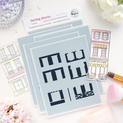 Das Stempelset "Darling District" (Artikel-Nr. 00127274) stammt von der Designerin Inna Moreva. Passend dazu sind im Shop Outline-Stanzschablonen (Artikel-Nr. 00127273) und Schablonen zur schichtweisen Koloration der Motive (Artikel-Nr. 00127272) erhältlich. Der Stempel ist auch als Press Plate (Artikel-Nr. 00127271) für das BetterPress-System von Spellbinders erhältlich.