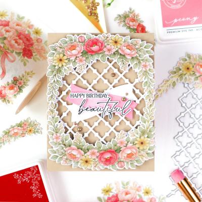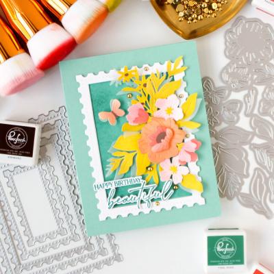 Das Stempelset "Celebrate in Blooms" (Artikel-Nr. 00128426) stammt von der Designerin Kinnari Zaveri. Passend dazu sind im Shop Outline-Stanzschablonen (Artikel-Nr. 00128425) und Schablonen zur schichtweisen Koloration der Motive (Artikel-Nr. 00128424) erhältlich. Das Washi Tape passt im Design perfekt zu dem Set und hat eine Länge von ca. 10m sowie eine Breite von 10cm (Artikelnummer: 00128423).