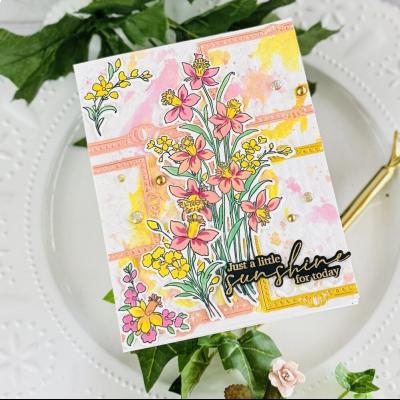 Das Stempelset "Whispering Daffodils" (Artikel-Nr. 00128430) stammt vom The Whimsical Creative Design Studio. Passend dazu sind im Shop Outline-Stanzschablonen (Artikel-Nr. 00128429) und Schablonen zur schichtweisen Koloration der Motive (Artikel-Nr. 00128428) erhältlich. Das Washi Tape passt im Design perfekt zu dem Set und hat eine Länge von ca. 10m sowie eine Breite von 10cm (Artikelnummer: 00128427).