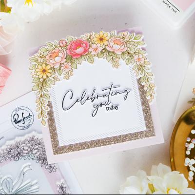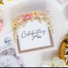 Das Stempelset "Celebrate in Blooms" (Artikel-Nr. 00128426) stammt von der Designerin Kinnari Zaveri. Passend dazu sind im Shop Outline-Stanzschablonen (Artikel-Nr. 00128425) und Schablonen zur schichtweisen Koloration der Motive (Artikel-Nr. 00128424) erhältlich. Das Washi Tape passt im Design perfekt zu dem Set und hat eine Länge von ca. 10m sowie eine Breite von 10cm (Artikelnummer: 00128423).