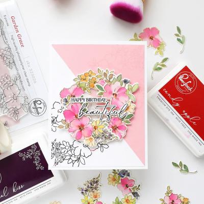 Das Stempelset "Garden Grace" (Artikel-Nr. 00128418) stammt von der Designerin Dawn Woleslagl. Passend dazu sind im Shop Outline-Stanzschablonen (Artikel-Nr. 00128417) und Schablonen zur schichtweisen Koloration der Motive (Artikel-Nr. 00128416) erhältlich. Das Washi Tape passt im Design perfekt zu dem Set und hat eine Länge von ca. 10m sowie eine Breite von 10cm (Artikelnummer: 00128415).
