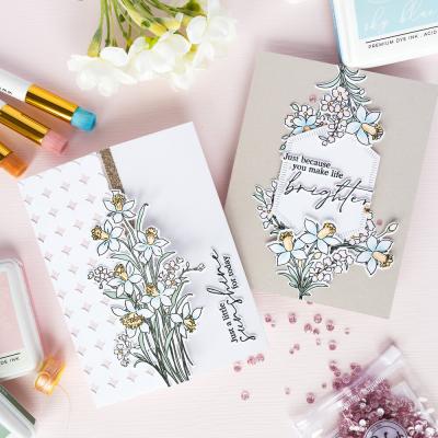Das Stempelset "Whispering Daffodils" (Artikel-Nr. 00128430) stammt vom The Whimsical Creative Design Studio. Passend dazu sind im Shop Outline-Stanzschablonen (Artikel-Nr. 00128429) und Schablonen zur schichtweisen Koloration der Motive (Artikel-Nr. 00128428) erhältlich. Das Washi Tape passt im Design perfekt zu dem Set und hat eine Länge von ca. 10m sowie eine Breite von 10cm (Artikelnummer: 00128427).