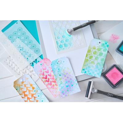 Mit Stencils lassen sich schöne Hintergründe herstellen. Dabei könnt ihr Stempelkissenfarben, Strukturpasten, Sprühfarben und vieles mehr verwenden. Der Fantasie sind fast keine Grenzen gesetzt.